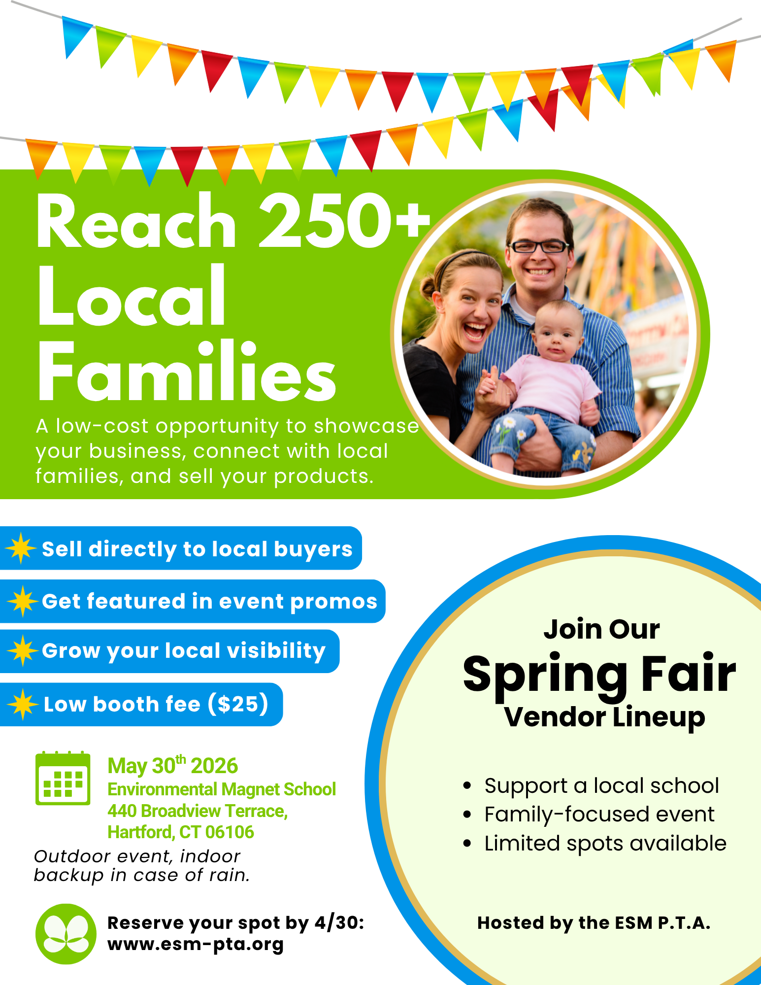 The Spring Festival will take place at Environmental Sciences Magnet School in Hartford. Parking is available nearby. Additional setup instructions will be shared with confirmed vendors.